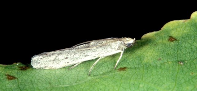 L'arna de gira-sol és una petita papallona amb ales grises poc visibles