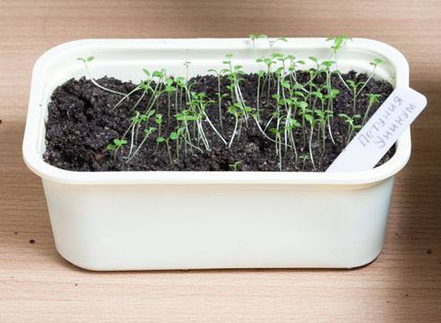 - Les plàntules de petúnia no s'han de cultivar en contenidors amb vores altes.... Poden crear una mena de barrera per a la penetració dels raigs de llum. En aquest cas, les plantes, per obtenir l’energia necessària, s’estendran per sobre de l’obstacle existent a la font de llum.