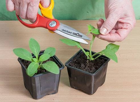 Primera vegada pessigueu les plàntules de petúnies necessari per a la formació de 6-7 fulles vertaderes. Com a regla general, en aquest moment la planta encara està al test, però, en condicions meteorològiques favorables, es pot plantar a terra. Pessigueu la part superior del brot principal amb tisores o ungles. Aquesta mesura permetrà desenvolupar brots laterals.