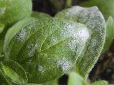 El míldiu apareix en forma d’una densa floració blanca que cobreix les fulles de les petúnies. Com a resultat d’aquest efecte, les plàntules perden la seva elasticitat i es tornen letárgiques. Les fulles sota el vel de la placa adquireixen un color groc i després marró.