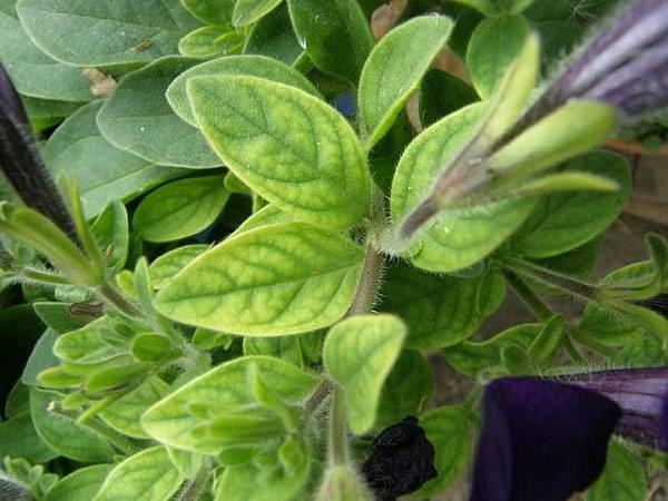 - Amb manca de ferro, les fulles de la petúnia es tornen grogues, però el color verd de les venes de les fulles es manté. Aquests símptomes indiquen el desenvolupament de la clorosi. És possible reposar la quantitat de ferro al sòl mitjançant els preparats "Cytofit", "Ferrovit".