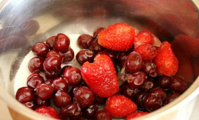 Compota refrescant de cireres i maduixes de fruites congelades