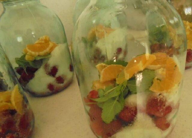 - Poseu baies, sucre, menta i taronja en capes en pots preesterilitzats.