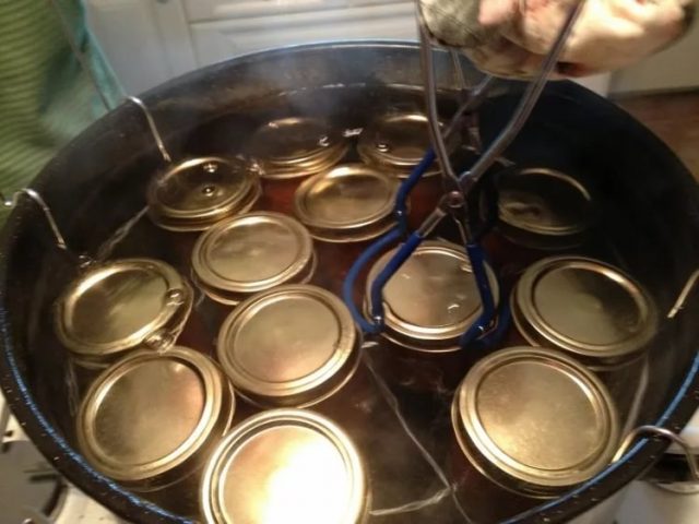 Escalfeu les llaunes amb una capacitat de 0,5 litres durant 10 minuts, litres (aproximadament 15 minuts, 3 litres) com a mínim mitja hora. Després de l’esterilització, les peces s’enrotllen fortament, es donen la volta a les tapes i s’emboliquen de manera càlida per a un refredament lent.