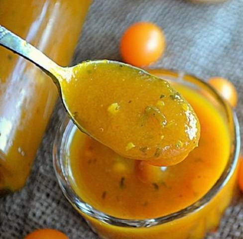 Traieu les llavors de la cirera i cuineu la polpa durant 10 minuts, i després tritureu-la. Per a aquesta operació són adequats un colador, un colador. Continuem cuinant, però ja barrejat amb tomàquets picats, alls, pebre i herbes. Després de 35 minuts de bull, afegiu-hi espècies, sal, vinagre i mel. Queda bullint 5 minuts i aboqueu la salsa en pots estèrils calents.