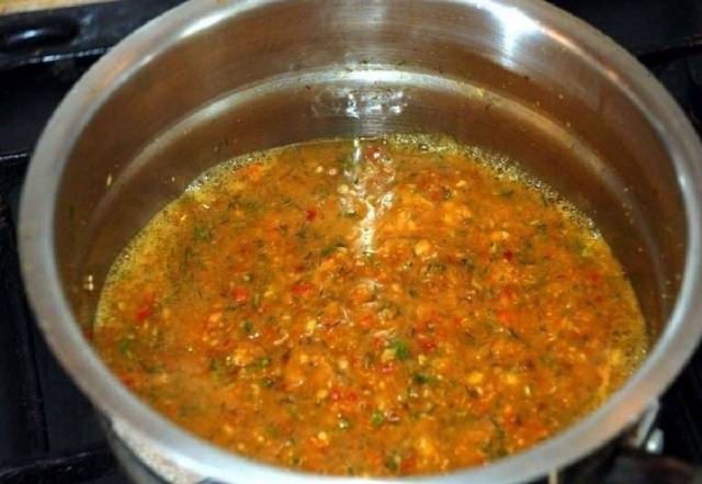 Poseu la barreja en una cassola, poseu-la a ebullició, afegiu-hi oli, herbes, sal i sucre. Ara siguem pacients i cuinem adjiku de tomàquets grocs en un termini de 45 minuts.