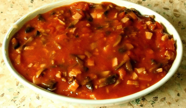 Per fer la salsa, cal pelar i moldre 1 kg de tomàquet fresc. A la composició s’afegeixen 20 g de sal i 30-50 g de sucre granulat. No cal afegir cap altra espècia a la pasta, ja que s’afegiran al plat principal.