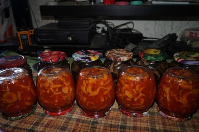 Els bolets ja preparats amb salsa de tomàquet es tanquen en pots i es deixen refredar. A més, es recomana traslladar-los a un lloc fresc i fosc.
