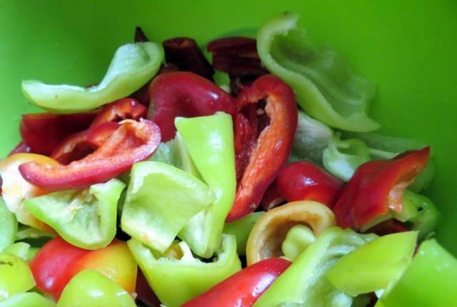 El següent pas per fer una amanida és abordar els pebrots: dolços i picants. Del dolç, netegeu tota la part interior amb llavors i mampares i talleu-les a trossos de mida convenient. El mateix es fa amb els pebrots picants.
