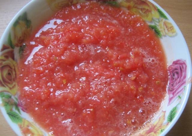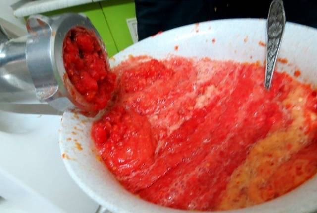 El segon pas és fer front als tomàquets. Si els tomàquets són massa densos o simplement et molesten, es pot treure fàcilment. Per fer-ho, prepareu dos bols d’aigua: poseu-ne un al foc i feu bullir, deixeu l’altre fred. Mentre l’aigua bull, fes una incisió en forma de creu als tomàquets de la part oposada a la cua. Tirar al seu torn els tomàquets en aigua bullent i treure'ls immediatament amb una cullera ranurada i posar-los en aigua freda. Després d’aquesta operació, de vegades la pell es rellisca sola o cal ajudar-la una mica. A continuació, talleu els tomàquets en 2-4 trossos, mentre traieu, si cal, totes les zones problemàtiques. Fregueu els tomàquets a través d’un molinet de carn i col·loqueu la massa fragant resultant en una cassola amb un fons espès a foc mitjà.