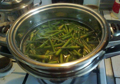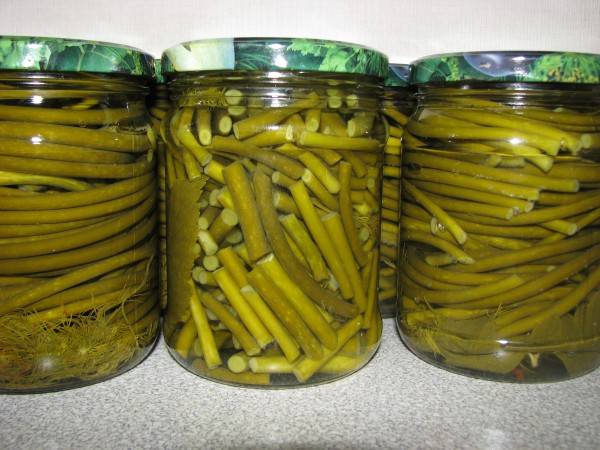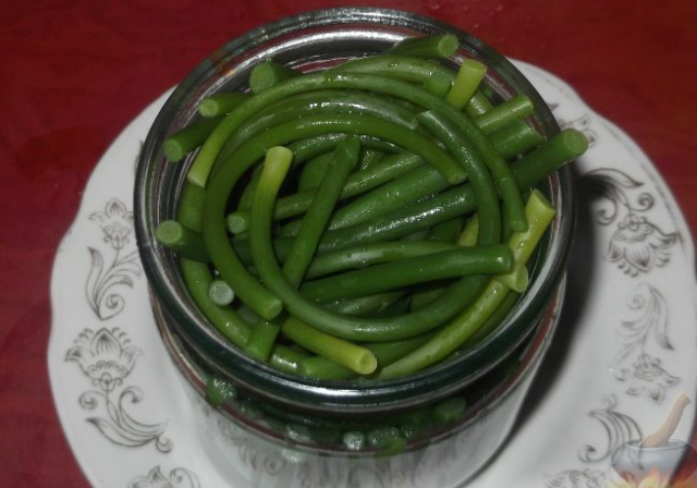 - Fletxes, tallades a trossos de 4-5 cm, blanquejades durant 3 minuts, refredades en aigua gelada. Per preparar salmorra, afegiu 25 ml de vinagre (9%) i 50 g de sal a 1 litre d’aigua. Feu bullir la salmorra. Ompliu els flascons esterilitzats nets amb fletxes i salmorra freda, tanqueu-los hermèticament. Emmagatzemar en un celler.