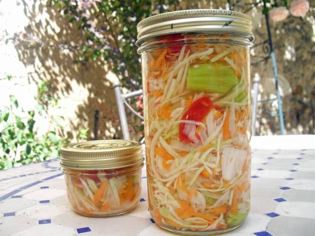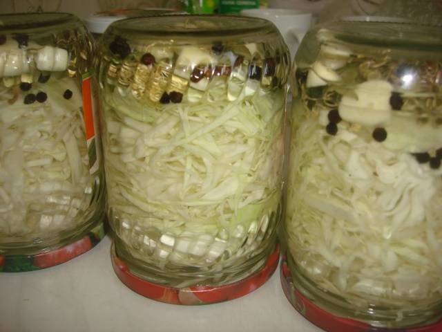La col en vinagre per a l'hivern es pot obtenir sense tractament tèrmic de les llaunes. Amb aquest mètode, la preparació dels adobats es realitza en diverses etapes: