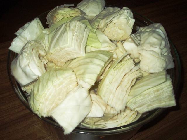 - En primer lloc, la col es talla en tires (1 cap de col), que es col·loca en un recipient profund en una sola capa.