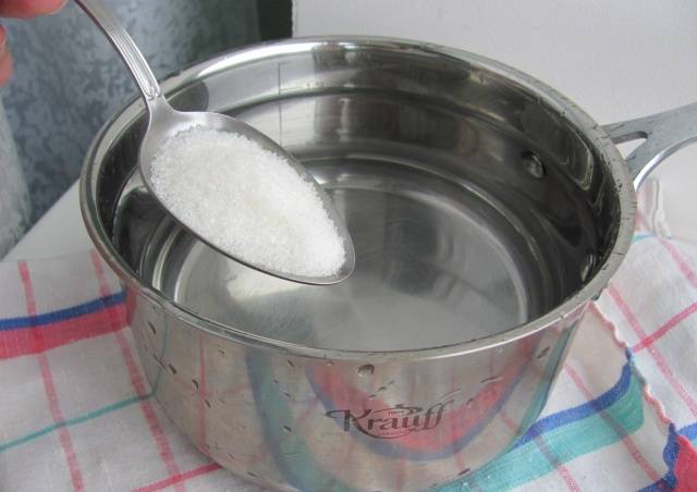 - Es posa una olla d’aigua a l’estufa per bullir. Es prenen 0,2 kg de sucre granulat i 40 ml de vinagre per litre de líquid.
