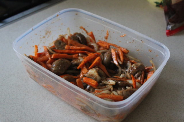 El menjar picant original es pot conservar conservant-lo durant un llarg període de temps. Aquesta recepta utilitza un adob aromatitzat amb salsa de soja.