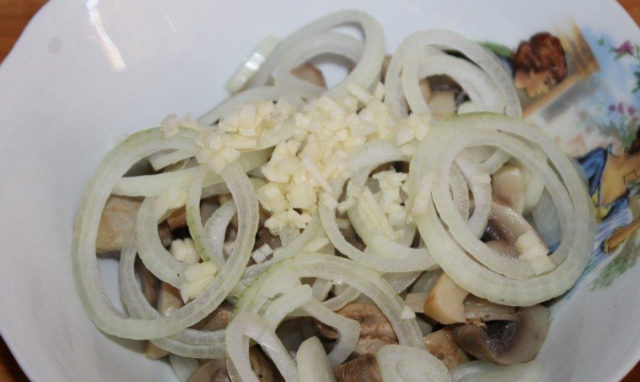 - Piqueu els xampinyons bullits, barregeu-los amb herbes i alls.