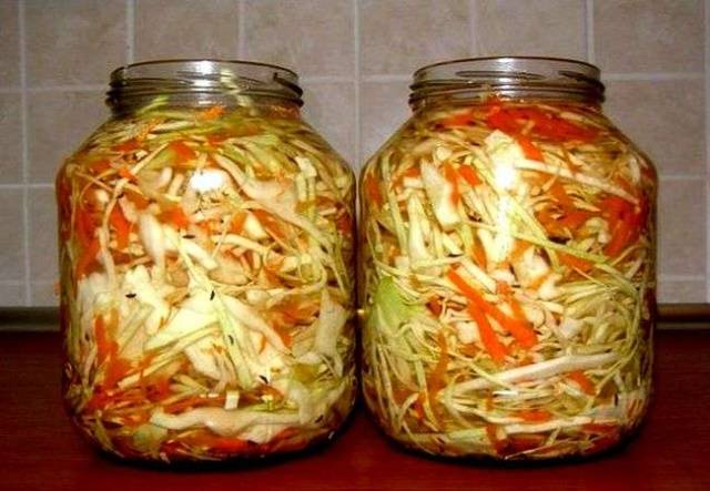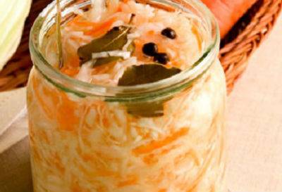La col es renta i es trosseja, les pastanagues es pelen i es ratllen sobre un ratllador gruixut. Després es barregen les verdures sense triturar. La massa vegetal es distribueix en pots. Primer s’ha de rentar i esterilitzar els envasos a vapor. A continuació, s’han d’abocar les verdures amb salmorra refredada. Al final, heu de posar dues pastilles d’àcid acetilsalicílic a cada pot.