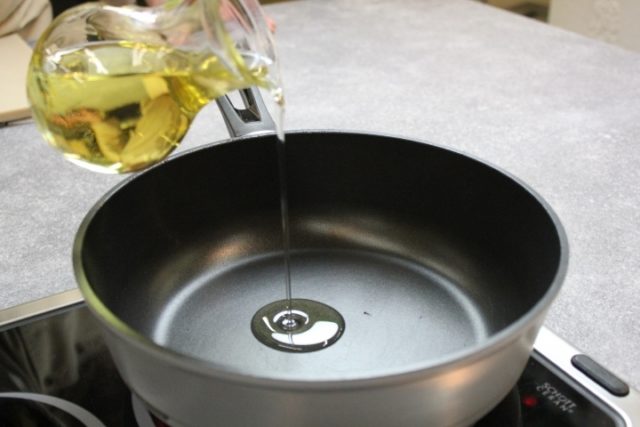 - Escalfeu l’oli en una paella: gira-sol o mantega.