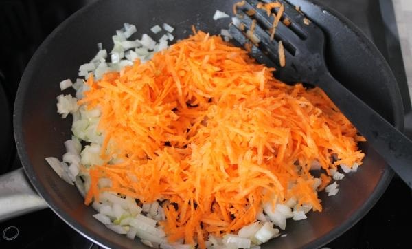 - Primer, salteu les cebes i, tot seguit, afegiu-hi les pastanagues. Quan canviï de color, afegiu-hi bolets a la paella. Cuini a foc lent durant 15 minuts, tapat.