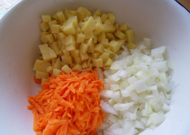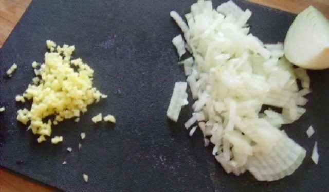 - Talleu a daus les cebes, les pastanagues, l'arrel de julivert, talleu els alls, deixeu-los coure a foc lent en oli d'oliva.