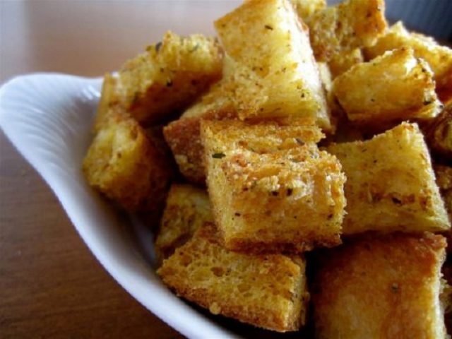 - Fregiu el pa amb la barreja de ceba-all.Talleu els crostons a daus, aboqueu-los en un plat refractari. Fregueu generosament amb formatge ratllat, coeu-ho al forn.