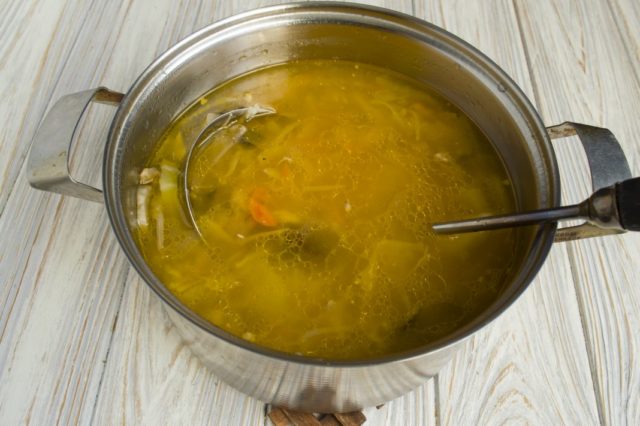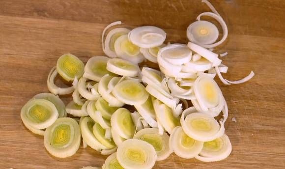 - Talleu el porro a anelles. Aboqueu-ho en sopa. Barrejar. Coeu-ho durant 5-7 minuts més.