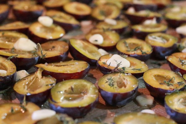 - Disposar les meitats de les fruites rentades i sense pinyols, tallar-les, sobre una plata de forn coberta amb paper de forn. Espolvoreu amb una barreja de sal i herbes.