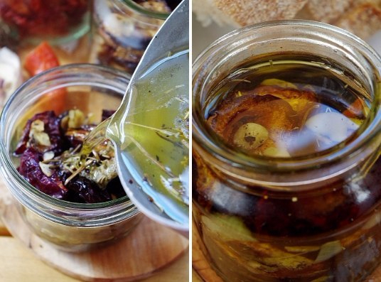 - Afegiu al pot una barreja d’olis de gira-sol i d’oliva perquè els fruits quedin completament coberts. Tanqueu la tapa i poseu-la a la nevera.