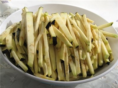 - Remull les albergínies seques en aigua bullent durant 20 minuts, afegiu sal i, a continuació, escorre-les en un colador.