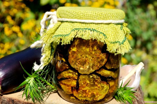- Poseu albergínies en recipients de vidre esterilitzats, espolvoreu-les amb espècies i sal i, a continuació, aboqueu-hi un amaniment calent.