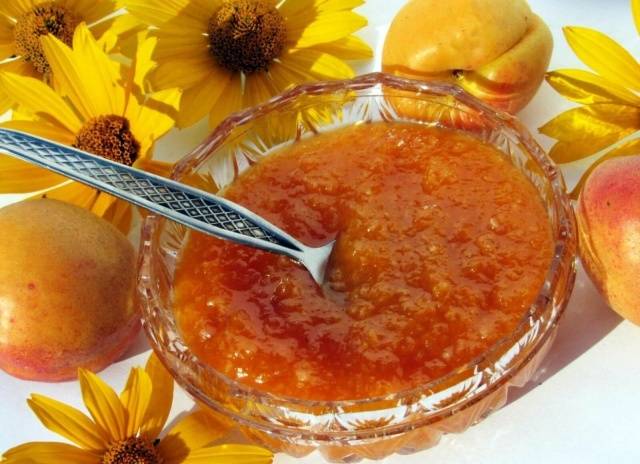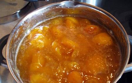 La resta del procés de cocció és senzill. 1 kg d’albercoc sense pinyol s’omple amb 1 kg de sucre, infusionat durant la nit. A continuació, la melmelada es posa a ebullició i en aquest moment s’hi afegeix la massa taronja d’una taronja gran, ratllada a través d’un ratllador. La melmelada es bull a foc mitjà durant 15-20 minuts, després es refreda i es torna a posar al foc. Aquesta vegada es redueix fins a la transparència de la fruita, amb remenada constant.