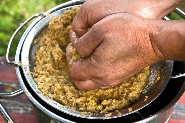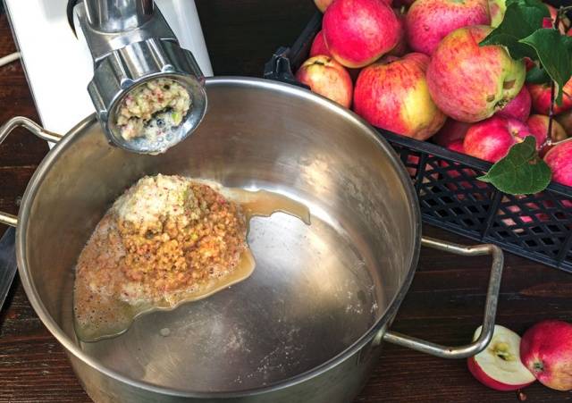- Obtenir suc. Ara cal fer el més difícil: extreure suc del ranetki. Per fer-ho, primer s’ha de picar les pomes, això es pot fer amb un triturador de carn, espremedora, batedora, ratllador o processador d’aliments. La tasca de l’enòleg és, idealment, obtenir suc de ranetka pur. Però per al vi, també és adequada la salsa de poma semilíquida.