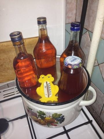 Per mantenir la temperatura necessària, cal afegir constantment aigua freda a la cassola. Això es fa en petites porcions. En aquest cas, seguiu els indicadors del termòmetre. No aboqueu mai aigua sobre les ampolles.