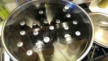 Es posa una cassola gran a l’estufa, però encara no s’encén el foc. El primer pas és posar la reixa al fons. A sobre hi posen ampolles de vi preparades. A continuació, s'aboca aigua a la cassola, que hauria d'arribar al coll de les ampolles plenes.