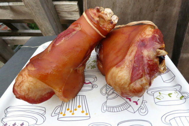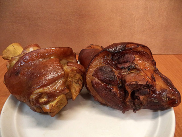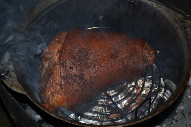 Podeu cuinar els artells de porc fumats calents a casa en un mini fumador en una estufa de gas.