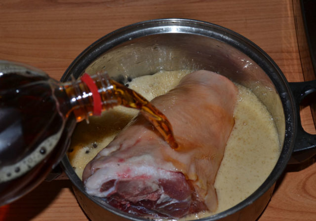- Col·loqueu els artells preparats en un plat adequat. Afegiu-hi la ceba gran pelada, tallada a quarts, els grans d’all sense pelar, aixafats amb el costat pla d’una fulla de ganivet, sal i sucre. Aboqueu-hi cervesa. Si no cobreix completament el porc, afegiu-hi aigua. Deixeu-ho durant la nit.