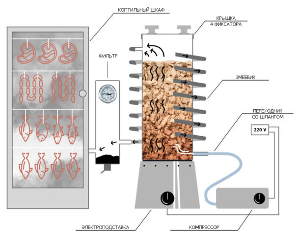 Fumar en fred és un procés llarg i complicat. És molt important pre-salar bé el producte, ja que en aquesta fase hauria d’estar completament preparat per al seu ús i al fumador només adquirirà un aroma específic. Sovint a casa, el porc es bull primer. Per preparar aquesta delícia, cal un fumador de fumat fred. És un recipient per a productes i una cambra de combustió situada a una distància d’1,5 m. Estan connectats per una xemeneia, que sovint es troba sota terra. Mentre el fum passa per la canonada fins al contenidor amb carn, es refredarà fins a la temperatura desitjada (19-25 graus). Una opció més senzilla per a ús domèstic és un generador de fum. Aquest dispositiu per a la formació i el transport de fum a la cambra amb productes facilita enormement el procés de fumar en fred. El generador de fum consta d’un cos cilíndric, que també és una càmera de combustió de serradures, a més d’una canonada per al subministrament de fum, un broc de conductes d’aire, un fons extraïble amb una cambra per a cendres i quitrà, un compressor, una tapa amb pinces.