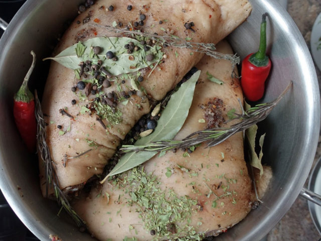 - Peleu els alls, passeu-los per una premsa i afegiu-los al recipient amb les canyes. A continuació, aboqueu la marinada refredada, tanqueu la tapa i poseu-la a la nevera durant 4 dies. El porc ha d’estar totalment submergit a la salmorra. En el procés de decapatge, cal girar-los diverses vegades.