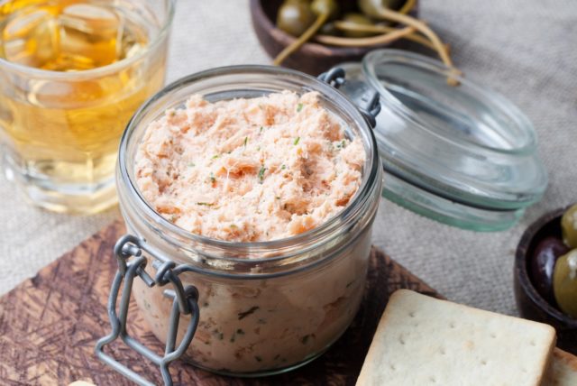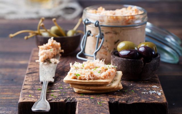 - El producte acabat se serveix estès sobre galetes o llesques de pa. Si ho desitgeu, podeu decorar-los amb tascons de llimona i branquetes d’herbes fresques.