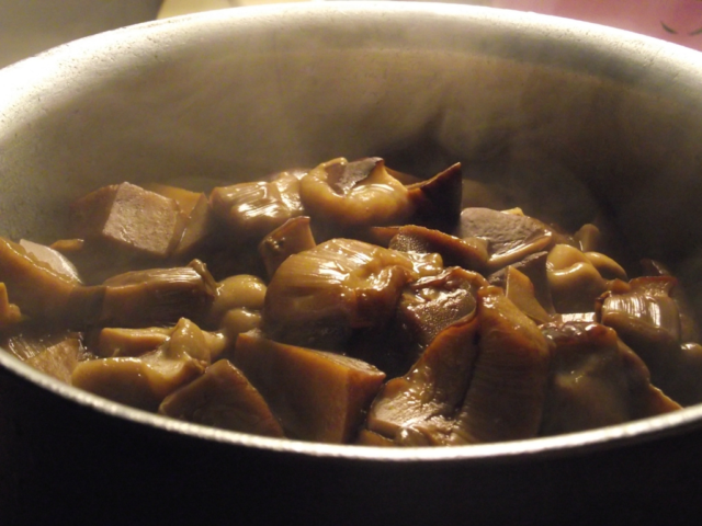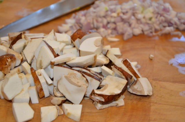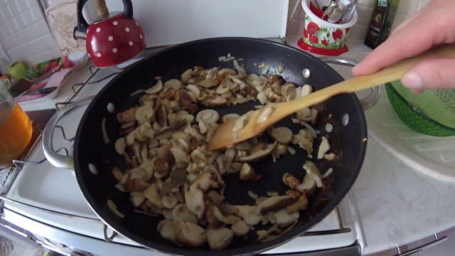 - Guisar el vostre propi suc. Afegir la ceba picada i l’oli vegetal. Saleu al final quan es torrin els cossos fructífers.